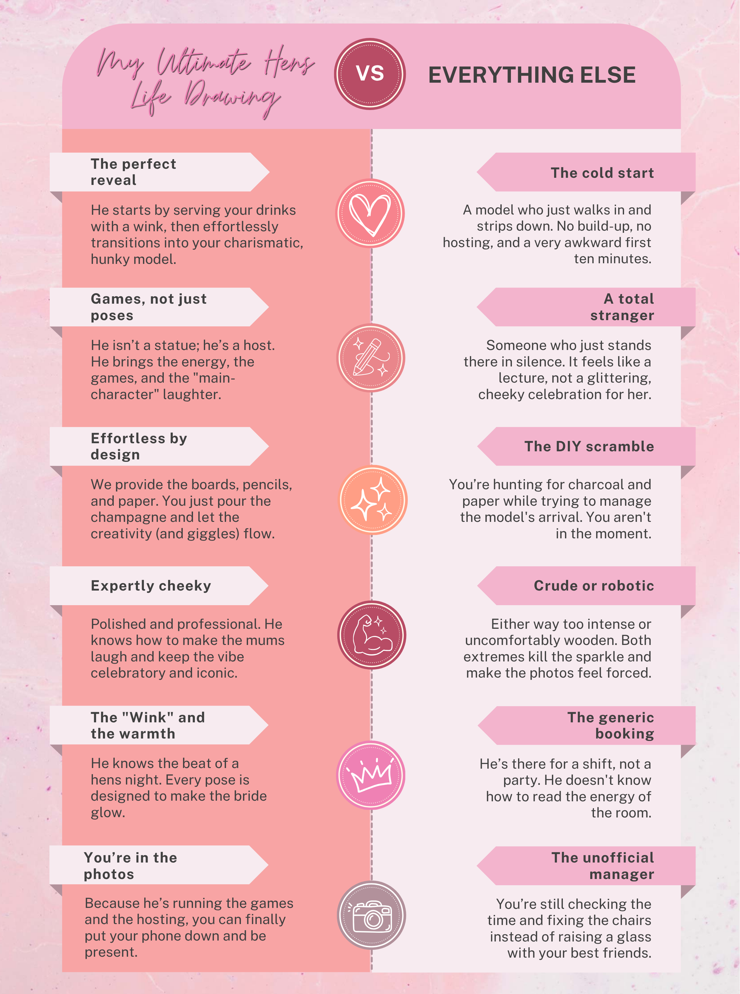 A My Ultimate Hens Life Drawing Experience is curated, choreographed, and created exclusively for hens. It’s the difference between sitting through a class and starring in an experience. From the moment you walk in, the music, the lighting, and the laughter align, and the sparkle never dips. Our handpicked My Ultimate Hens models and fabulous hosts know exactly how to keep the energy alive, the group connected, and your bride at the heart of every moment.